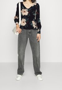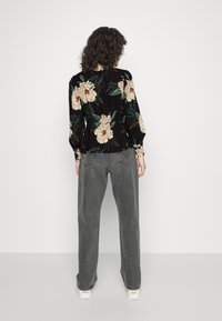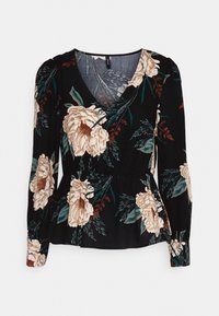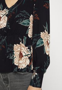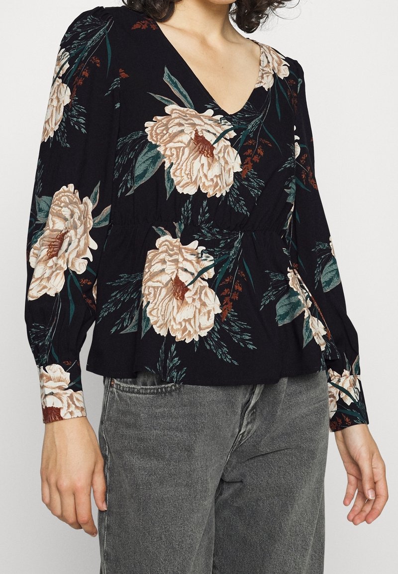 Blouse noire à motif floral avec un décolleté en V profond, ornée de grandes pivoines beiges et de feuilles vertes, taille froncée et manches longues et amples.