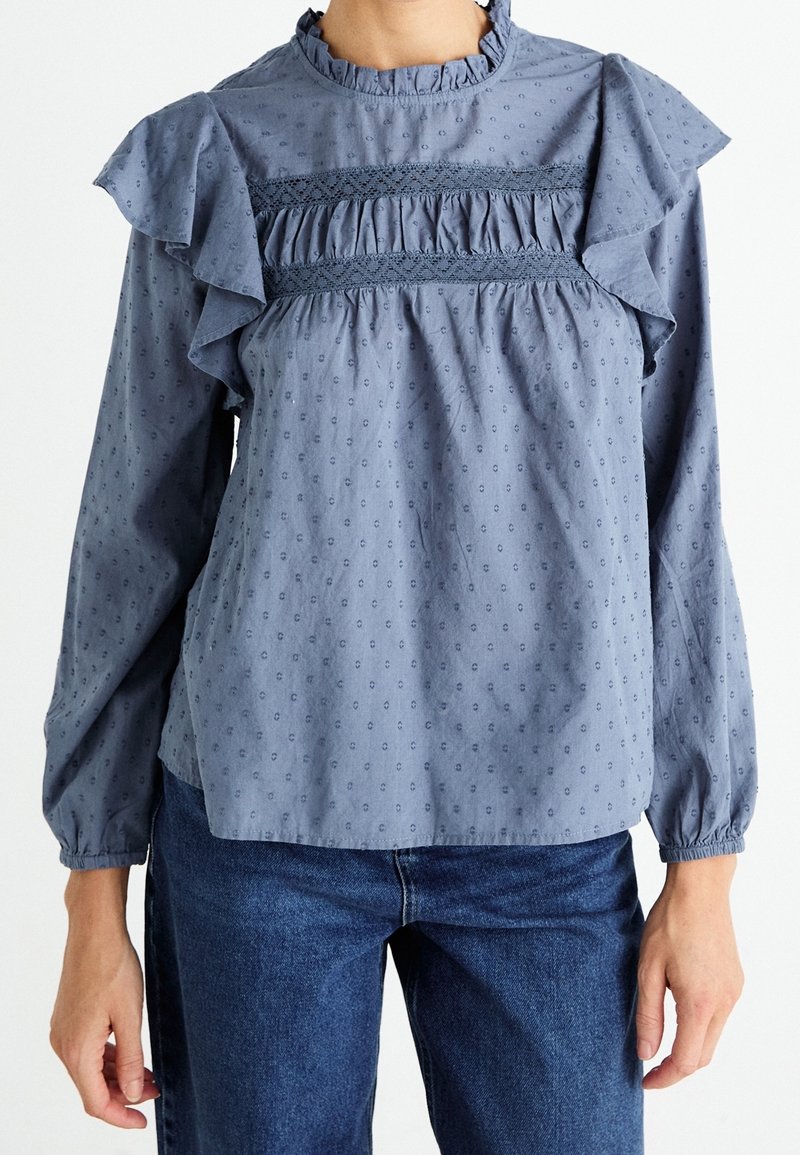 Blouse bleue à manches longues avec empiècement à volants, détails en dentelle, motif à petits pois subtil, portée avec un jean en denim bleu par une personne debout sur fond blanc.
