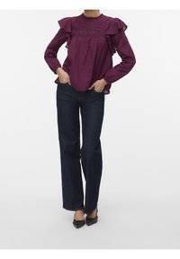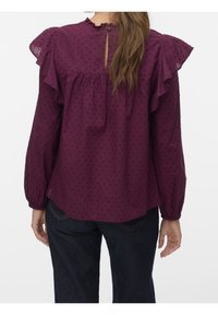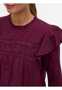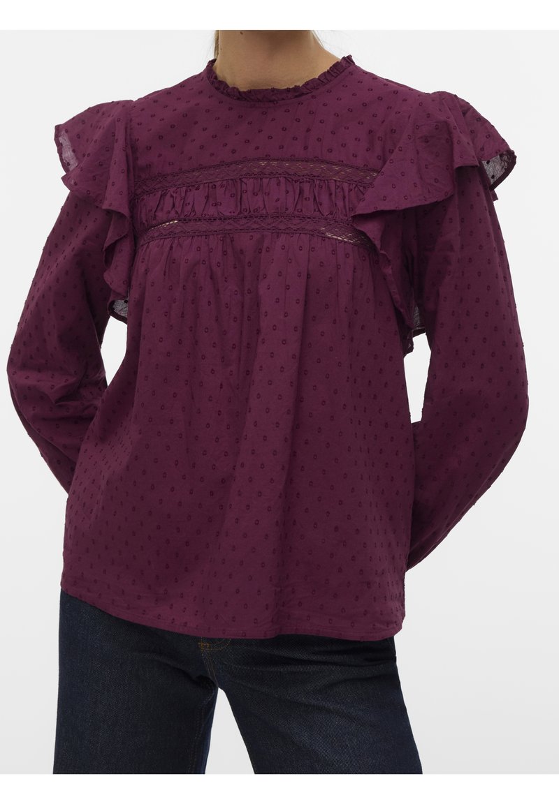 Blouse violette à manches longues avec épaules à volants, pois texturés, et une bordure en dentelle sur la poitrine. Coupe ample.