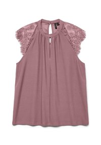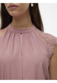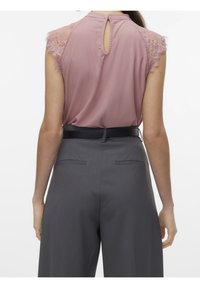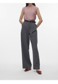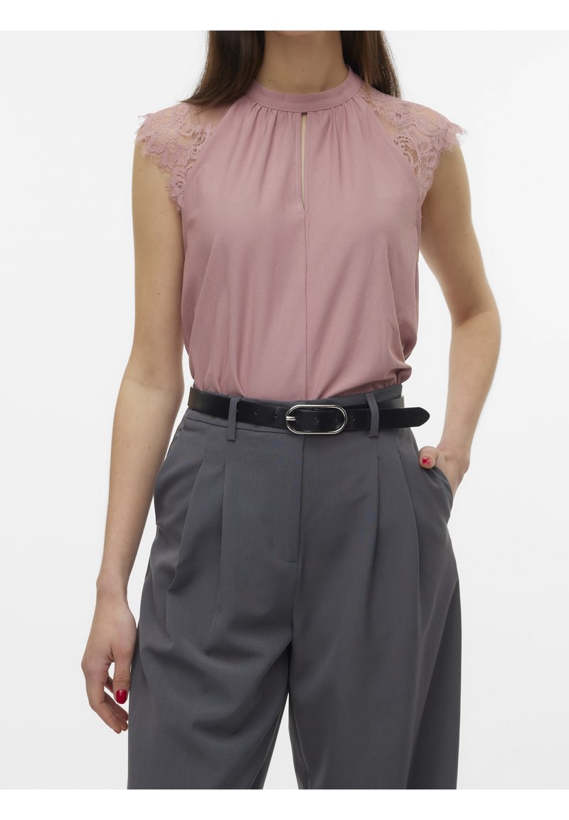 Haut sans manches en tissu rose doux avec des accents en dentelle sur les épaules et une découpe en forme de goutte, associé à un pantalon gris taille haute et une ceinture noire.