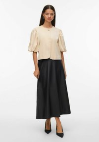 Femme portant un chemisier beige à manches ballon avec un bouton doré et une jupe noire, debout les mains jointes sur fond blanc.