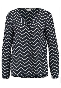 Blouse à motif noir et blanc avec col en encoche, manches longues et coupe décontractée, présentant des dessins abstraits sur un tissu doux.