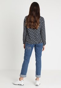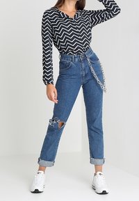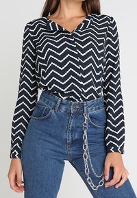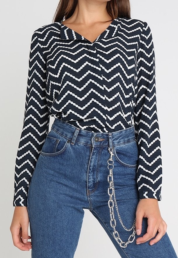 Femme portant un chemisier à manches longues à motif zigzag noir et blanc, rentré dans un jean bleu taille haute avec un accessoire chaîne argenté.