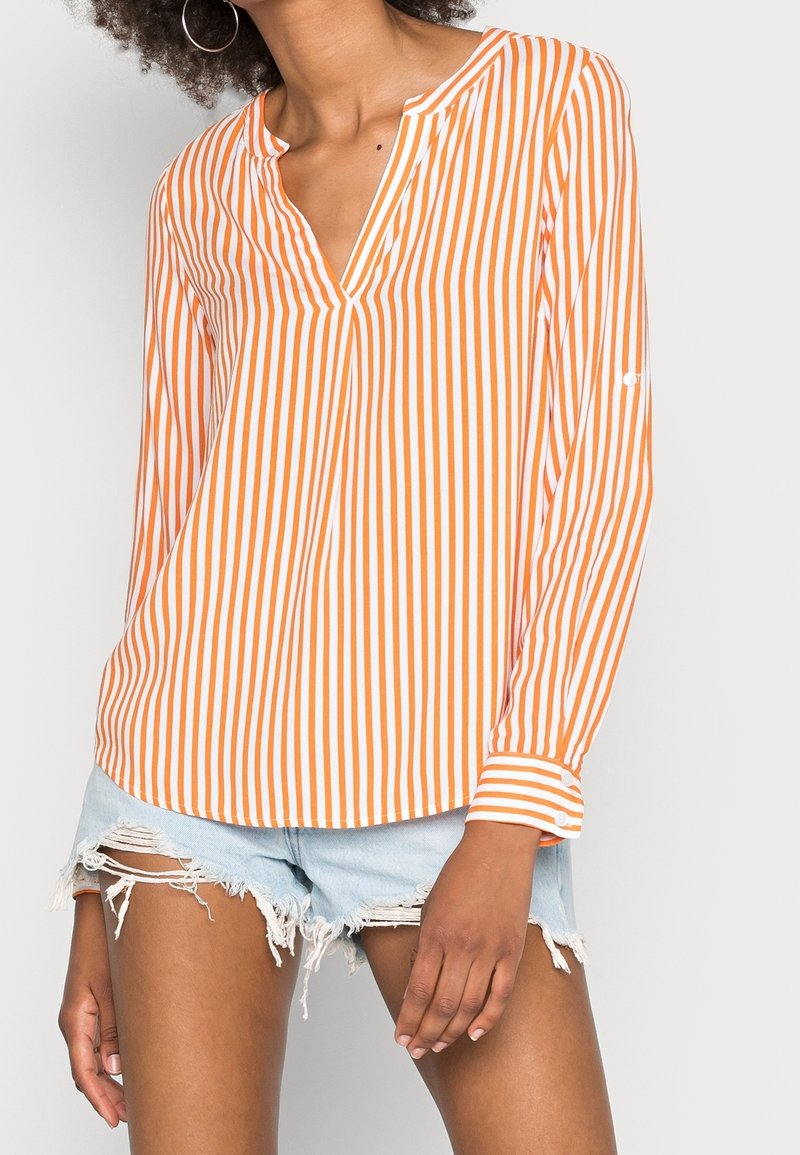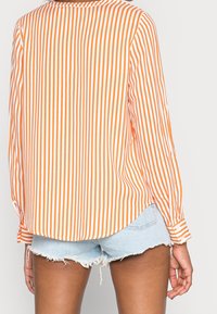 Femme portant un chemisier à manches longues à rayures verticales orange et blanches, associé à un short en denim bleu clair déchiré.