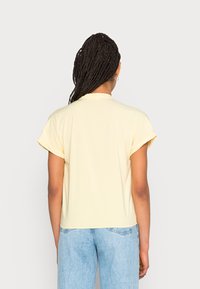 Chemise à manches courtes, boutonnée, de couleur jaune pâle, avec un col en V et en tissu doux, associée à un jean en denim bleu clair.