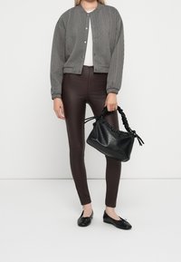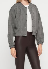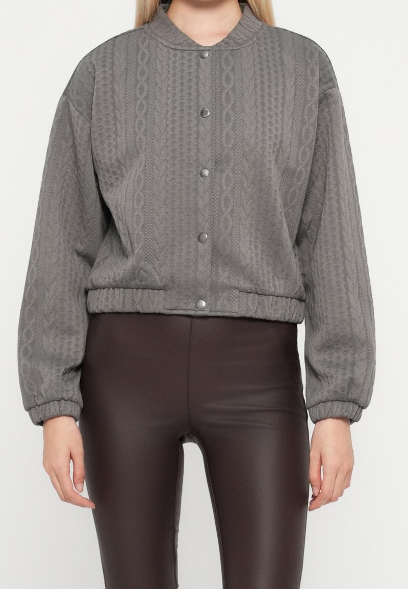Veste bomber matelassée grise avec un col rond, des boutons-pression à l'avant et des poignets élastiques. Portée avec un pantalon marron ajusté.