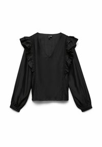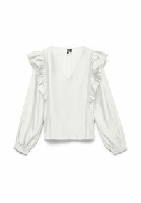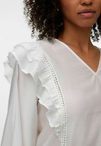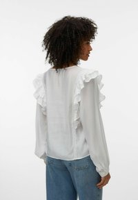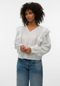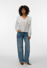 Femme aux cheveux bouclés portant un chemisier blanc à volants et manches longues et un jean bleu, debout devant un fond blanc uni.