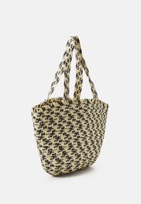 Sac cabas en paille tissée avec un motif en losanges noirs et deux bretelles, design spacieux à ouverture supérieure.