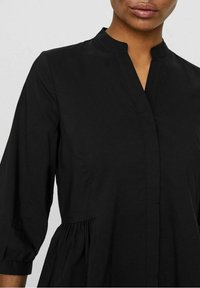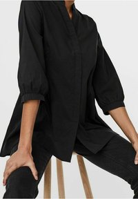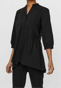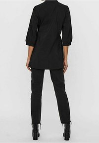 Tunique noire à manches longues avec détail froncé sur les côtés et col mandarin, portée avec un pantalon noir, vue du cou aux hanches.