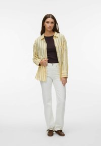 Femme aux longs cheveux bruns portant une chemise à rayures jaunes par-dessus un haut noir, un pantalon blanc et des chaussures marron, debout devant un fond uni.
