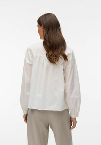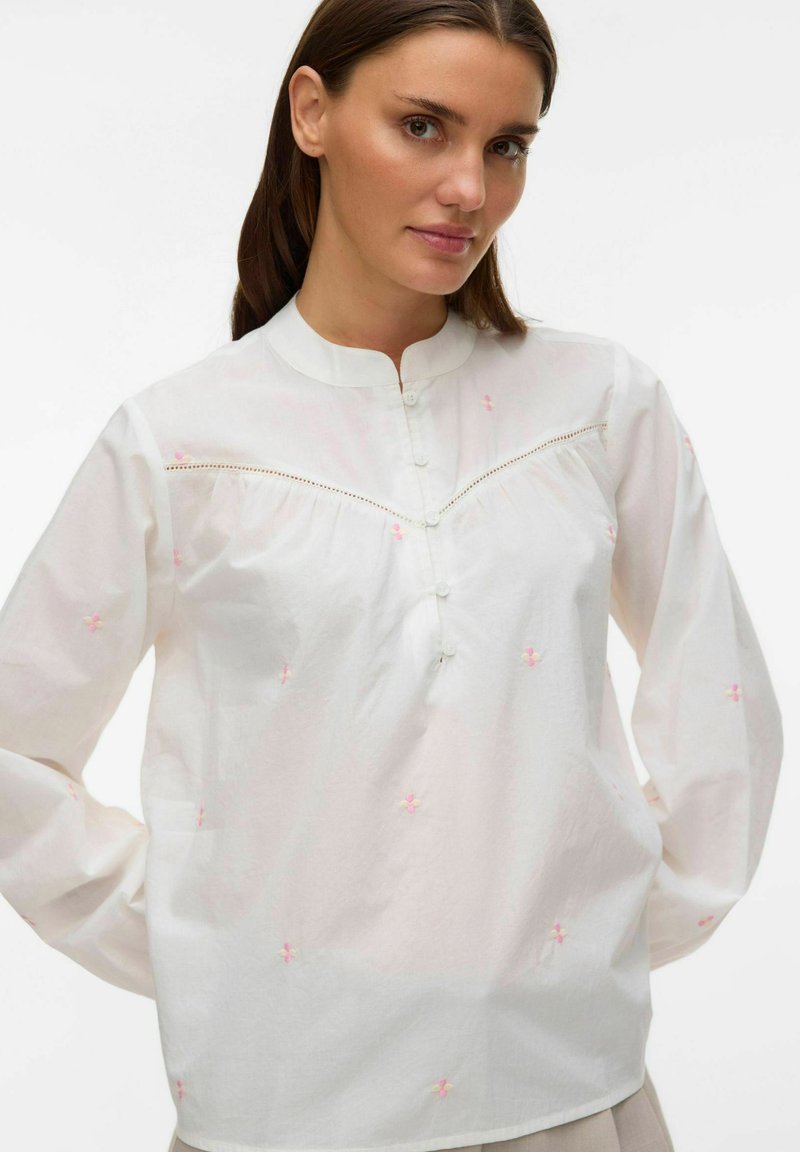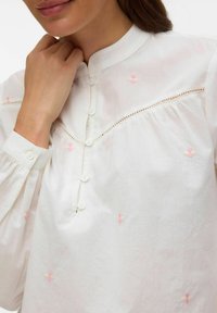 Femme portant un chemisier blanc à manches longues avec une petite broderie florale rose et un col mandarin, debout devant un fond uni.