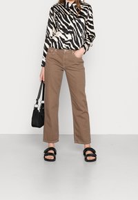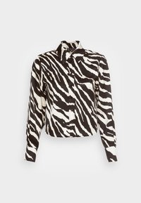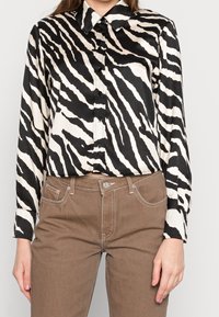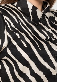 Chemise à boutons imprimée zèbre noir et blanc avec col, manches longues et texture brillante ; associée à un pantalon marron clair.