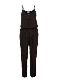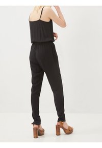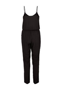 Combinaison noire à fines bretelles, patte de boutonnage avant, taille élastique et poches latérales. Associée à des sandales à plateforme marron.