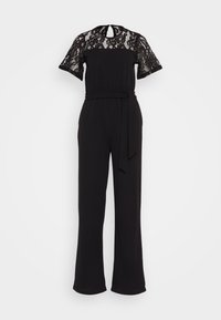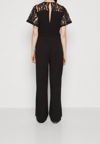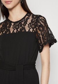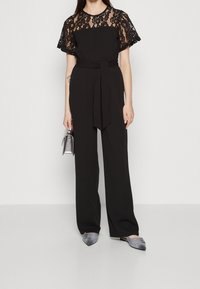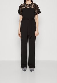 Femme portant une combinaison noire avec des manches courtes en dentelle, une ceinture à la taille et des chaussures métalliques à bout pointu, debout devant un fond uni.