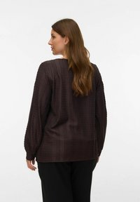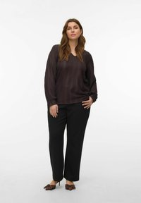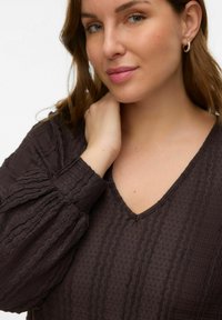 Blouse marron foncé texturée avec un col en V et des manches longues et bouffantes. Présente des rayures verticales et une coupe décontractée. Portée avec un pantalon noir.