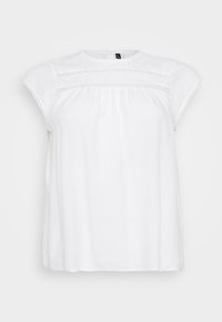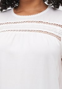 Blouse blanche à manches courtes avec découpes horizontales texturées, bordure en crochet sur les manches, et coupe ample. Tissu doux, encolure arrondie, style décontracté.