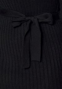 Femme portant une robe noire en maille côtelée, ajustée, à manches longues, avec une ceinture nouée à la taille, debout devant un fond blanc uni.