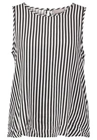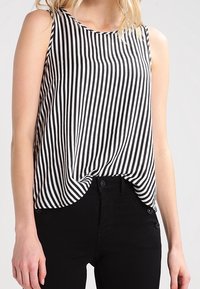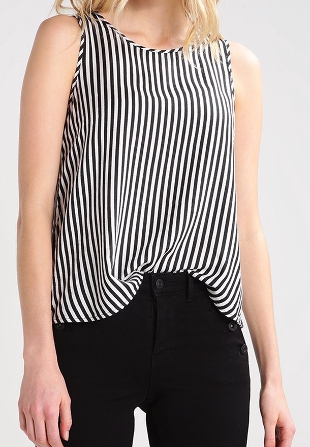Femme portant un haut sans manches à rayures verticales noires et blanches, légèrement rentré dans un pantalon noir taille haute.