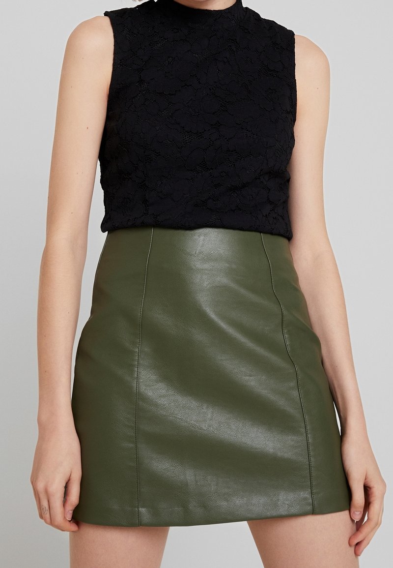 Femme portant un haut sans manches en dentelle florale noire rentrée dans une mini-jupe en cuir vert olive taille haute, sur un fond gris uni.