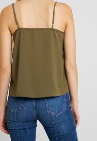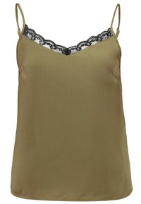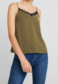 Haut caraco en satin vert olive avec une bordure en dentelle noire le long de l'encolure, bretelles fines et réglables, coupe décontractée, associé à un jean en denim bleu.