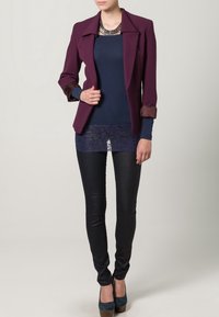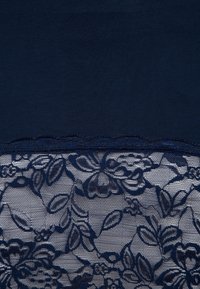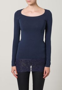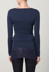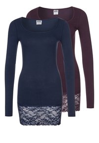 Deux hauts à manches longues : un bleu marine foncé et un bordeaux. Les deux présentent un ourlet en dentelle avec des motifs floraux. Texture de tissu lisse, encolure ronde.