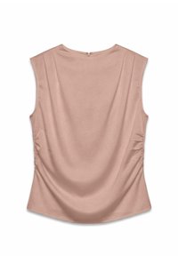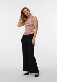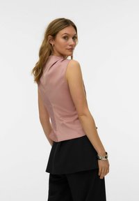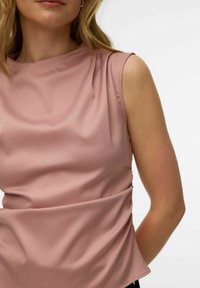 Femme aux cheveux blonds ondulés portant un haut en satin sans manches rose poussiére et une jupe noire sur un fond blanc uni.