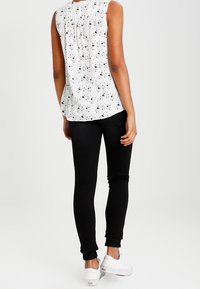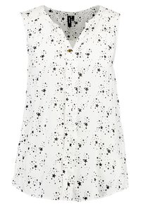 Blouse blanche sans manches avec motifs étoiles noirs, encolure en V et détail de bouton à l'avant, assortie à un jean noir ajusté.