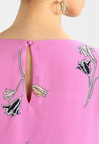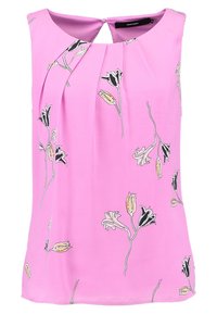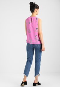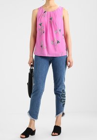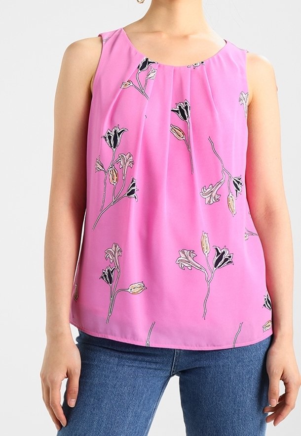 Blouse rose sans manches avec encolure plissée et imprimé floral noir et beige, portée avec un jean bleu.