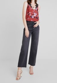 Blouse noire sans manches avec un motif floral rouge et rose portée avec un jean bleu par une femme debout.
