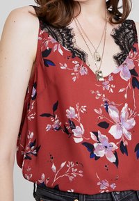 Femme portant un haut sans manches rouge à motifs floraux avec une bordure en dentelle noire et plusieurs colliers en or superposés, associée à un jean en denim noir taille haute.