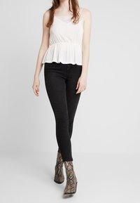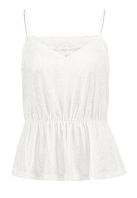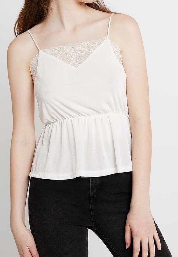 Haut blanc avec ourlet en dentelle, design en V et taille élastique. Texture fluide avec des bretelles fines. Associé à un jean noir.
