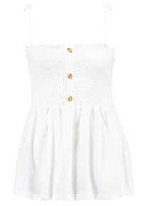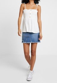 Haut péplum blanc sans manches avec encolure carrée, bordure à volants et trois boutons dorés. Porté avec une jupe en jean bleue à ourlet effiloché.