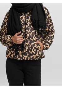 Personne portant une doudoune à imprimé léopard fermée, les mains dans les poches, avec une écharpe noire à franges enroulée autour du cou.
