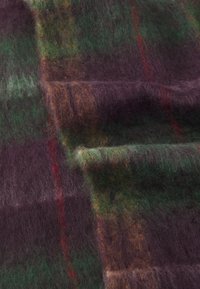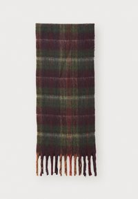 Écharpe en laine avec un motif tartan en vert foncé, bordeaux et touches de rouge, bordure à franges et texture douce.