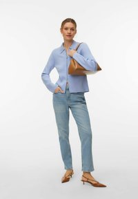 Femme portant un pull à fermeture éclair bleu clair avec col, un jean bleu clair, et portant un sac à bandoulière en cuir marron, les bras croisés.