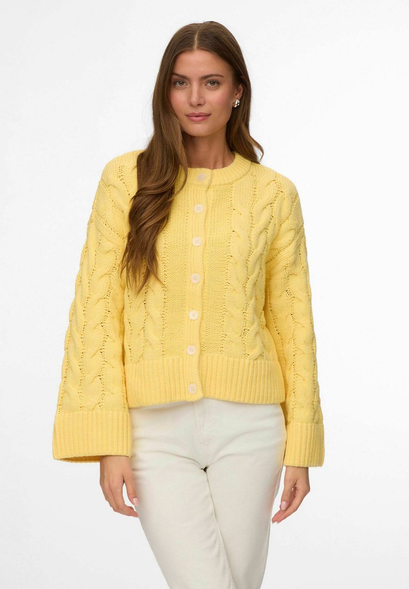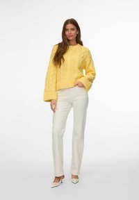 Femme aux longs cheveux bruns portant un cardigan jaune en grosse maille boutonné et un pantalon blanc cassé, debout devant un fond uni.