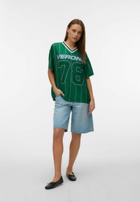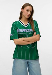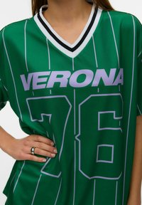 Femme aux longs cheveux portant un maillot de sport rayé vert avec le texte "VERONA 26", les bras croisés, et un jean bleu clair, sur un fond uni.