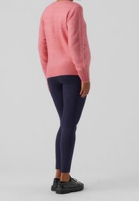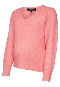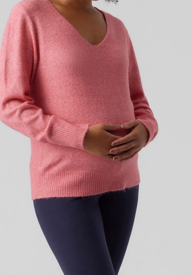 Personne en pull rose à col en V et pantalon foncé tenant doucement son ventre de femme enceinte sur un fond clair uni.