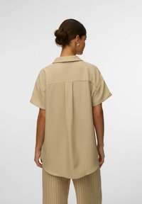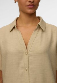 Femme aux cheveux foncés portant une chemise beige à manches courtes boutonnée et un pantalon beige à fines rayures verticales, tenant l'ourlet de la chemise d'une main.