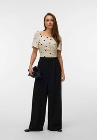 Femme portant un pantalon noir taille haute à jambes larges, un haut beige à manches courtes avec des pois noirs, tenant une pochette noire dans une main.