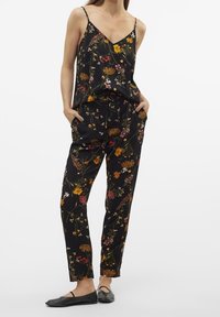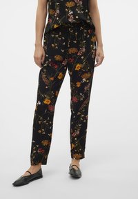Pantalons floraux noirs à coupe décontractée, dotés d'une taille ajustable par cordon, de motifs floraux multicolores et d'une finition légèrement brillante.