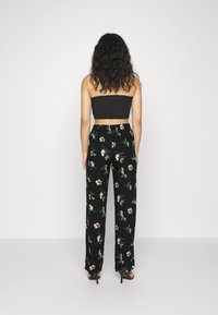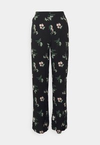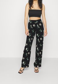 Pantalon noir à fleurs avec un design à jambes larges, présentant des motifs de fleurs roses et vertes. Fabriqué en tissu léger, associé à des talons strappy.