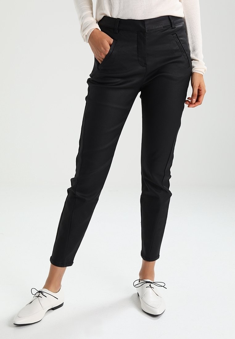 Pantalon slim en similicuir noir, avec poches latérales et texture lisse, associé à des chaussures blanches à lacets.