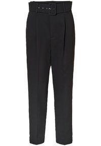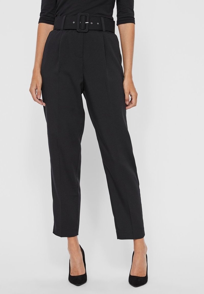 Pantalon noir sur mesure à taille haute, avec plis et une large ceinture ornée d'une boucle carrée. Tissu lisse avec une coupe ajustée au niveau de la cheville.