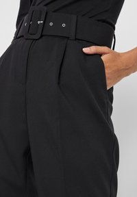 Pantalons noirs ajustés avec une silhouette cintrée, dotés de poches avant, d'une taille ceinturée et de poignets retroussés, associés à des talons hauts.