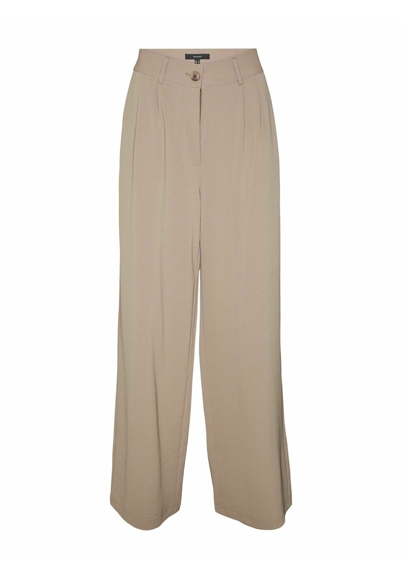 Pantalon beige à jambes larges avec une texture lisse, des plis à l'avant et une fermeture à un bouton. Conçu avec une taille haute pour une coupe décontractée.