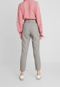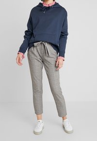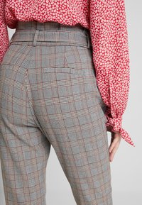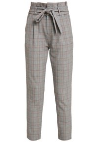 Pantalons tapered à carreaux gris avec une taille haute ceinturée et des poches, associés à des baskets blanches. Le tissu a une texture subtile et un design structuré.