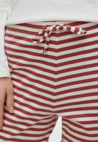 Personne portant un pantalon ample à rayures horizontales rouges et blanches avec une taille à cordon de serrage et des chaussures beiges à lacets, debout devant un fond uni.