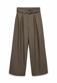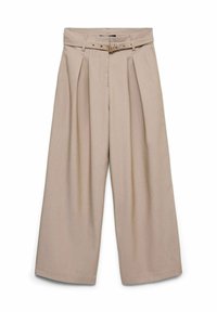Femme portant un pantalon taupe taille haute à jambes larges avec une ceinture assortie, un haut crème à manches longues côtelé, et des talons pointus marron ornés de clous.