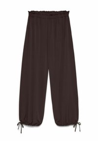 Femme portant un pantalon ample taupe à chevilles froncées, un haut noir à manches trois-quarts, tenant une pochette noire et portant des sandales à talons.